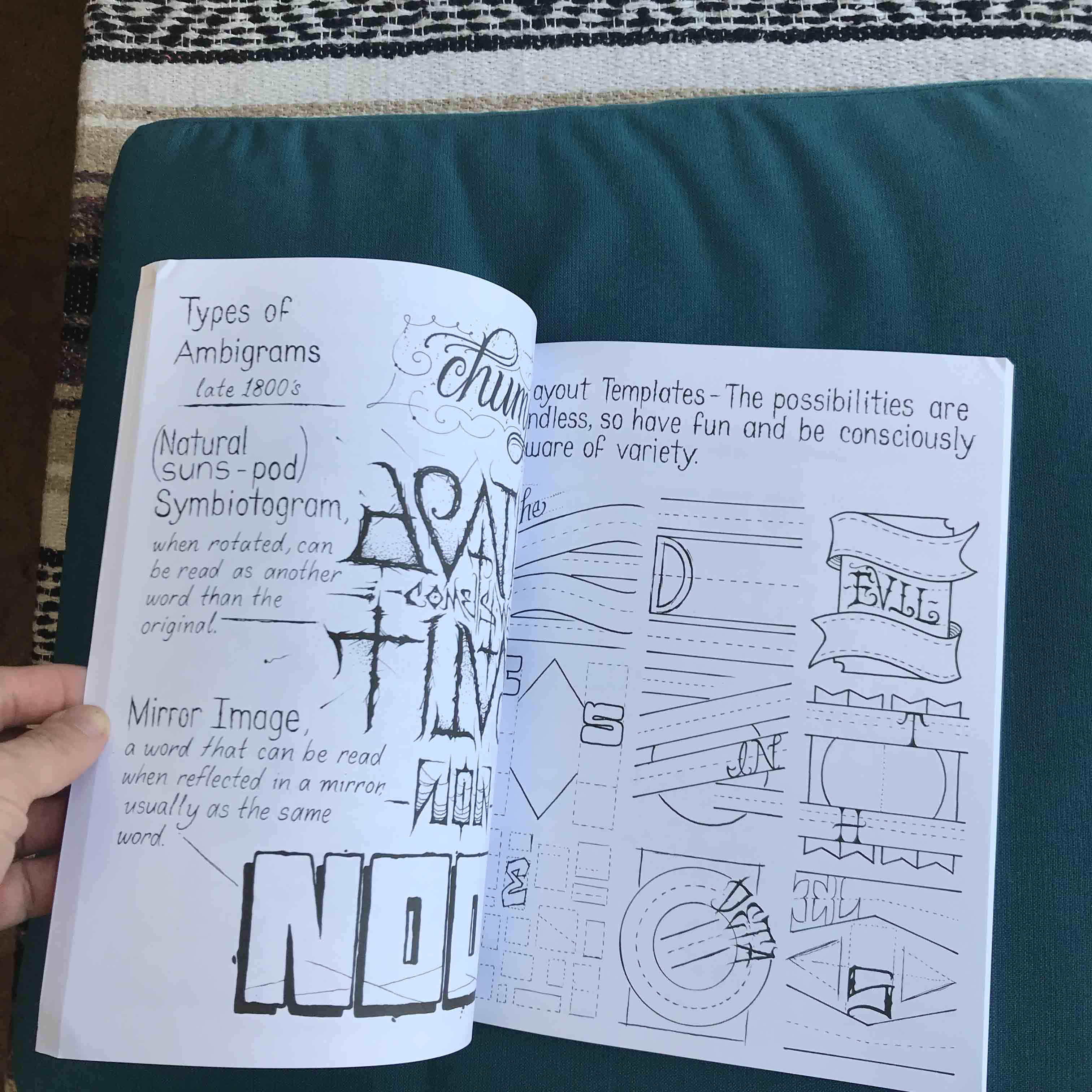 Back cover is a full color monogram word search. The only monogram word search on Earth and it alone has 180 styles of lettering. This guide has content useful for the tattooer, graffiti writer, sign painter, graphic designer, and housewife turned lettering enthusiast with an Etsy account. Every order will come with a couple of stickers